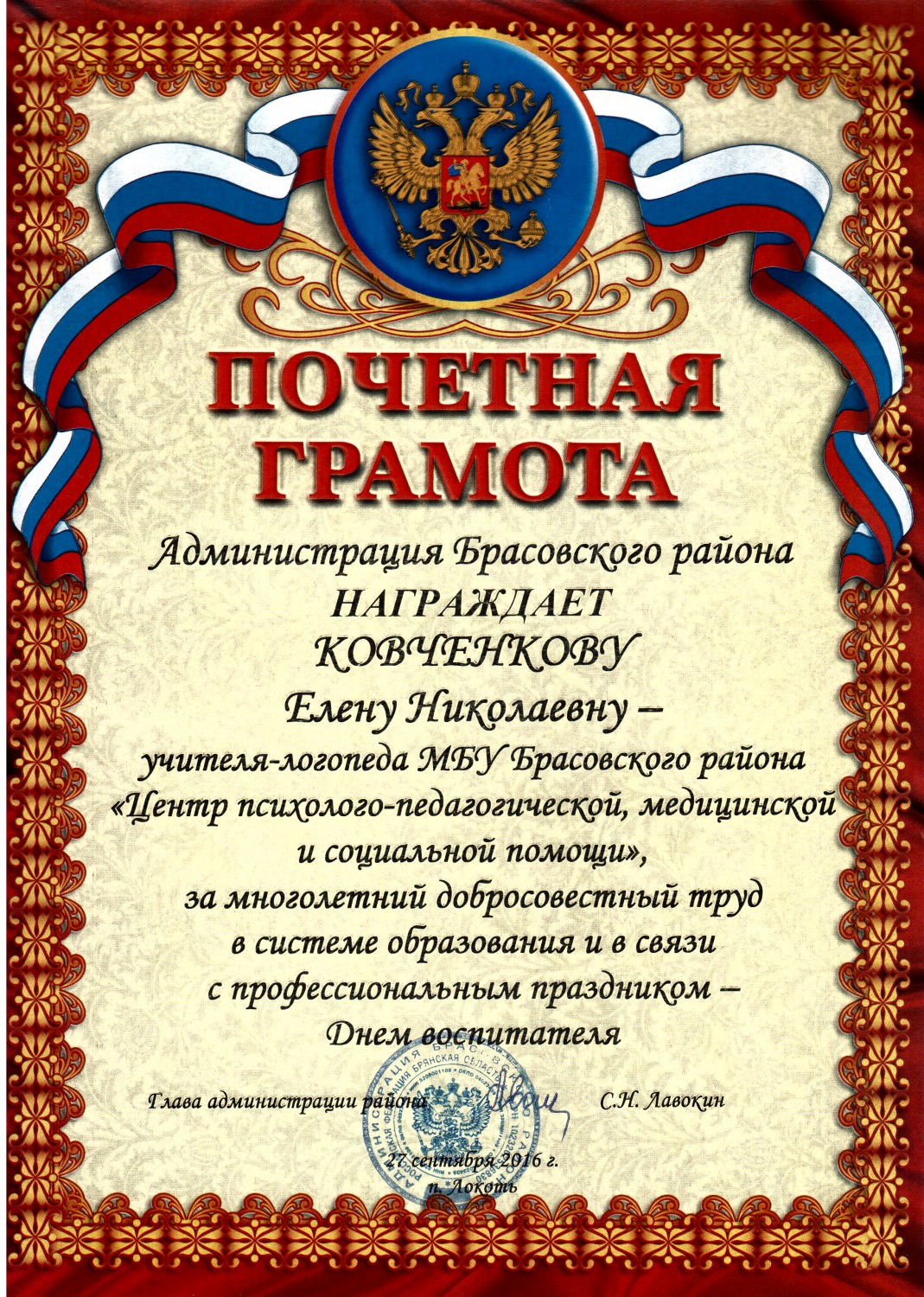 Ковченкова Елена Николаевна - учитель – логопед Центра ППМСП п. Локоть Брасовского района Брянской области