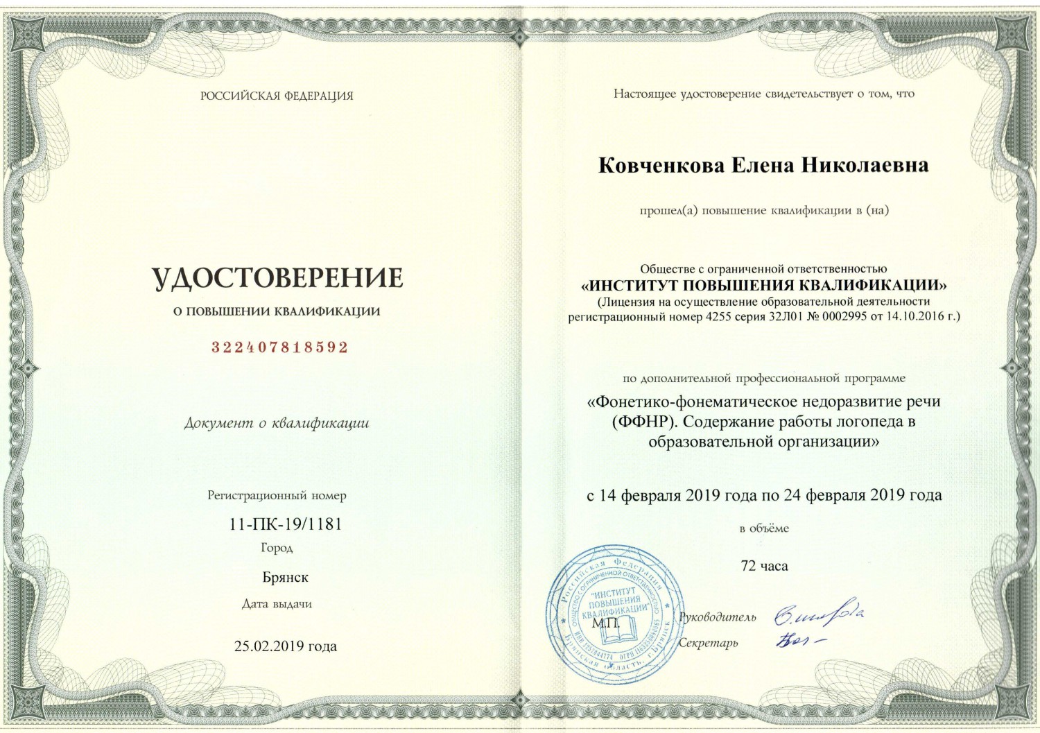 Брянский институт повышения квалификации Тема: «Фонетико – фонематическое недоразвитие речи (ФФНР). Содержание работы логопеда в образовательной организации» - Февраль 2019 г.